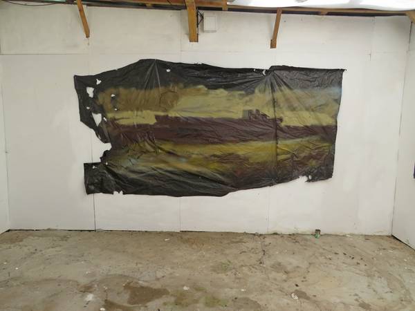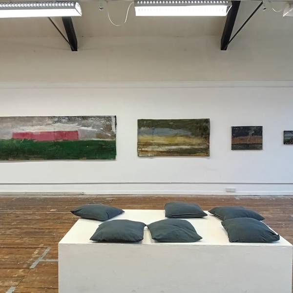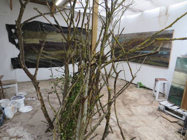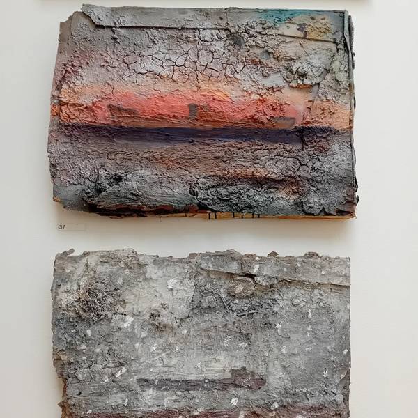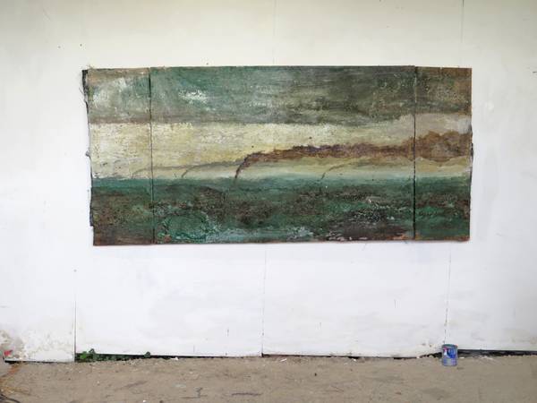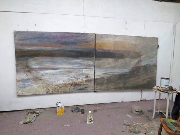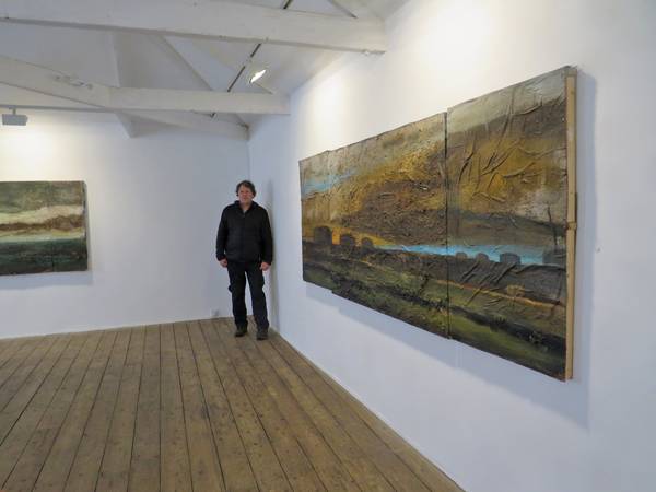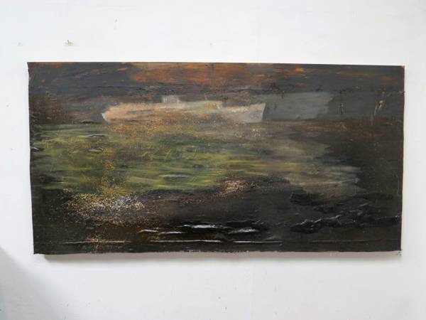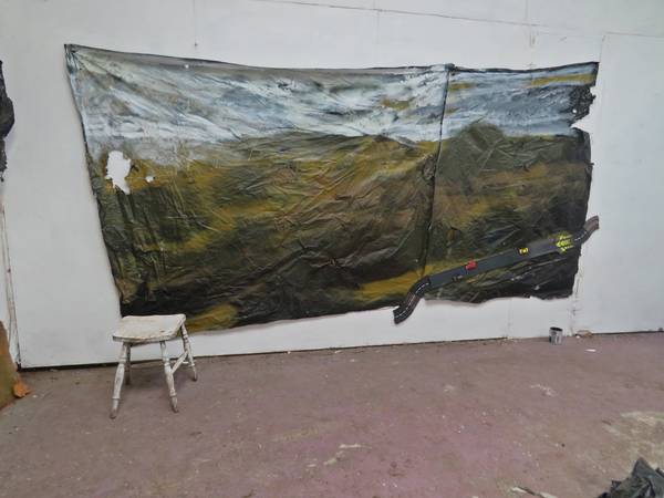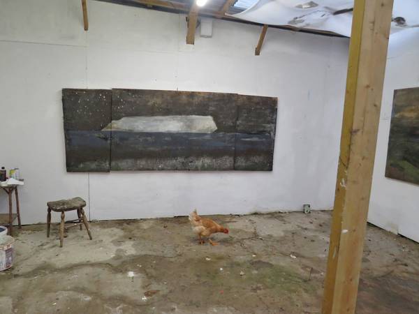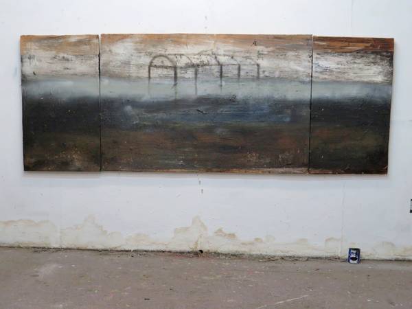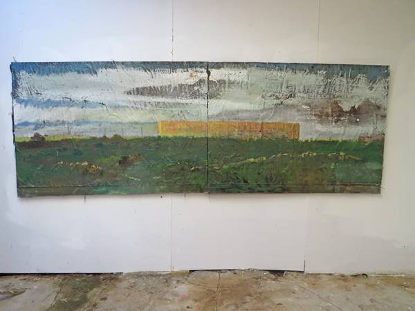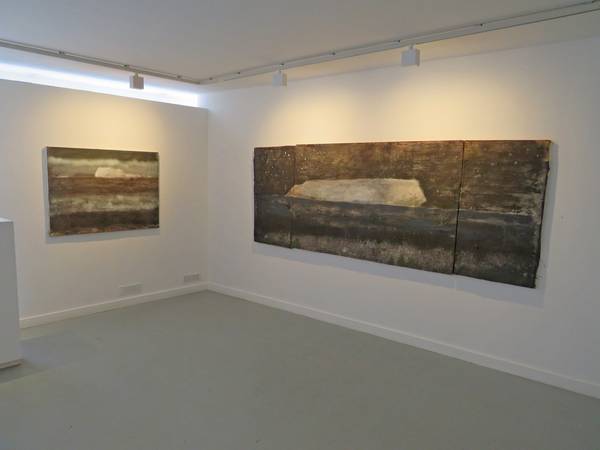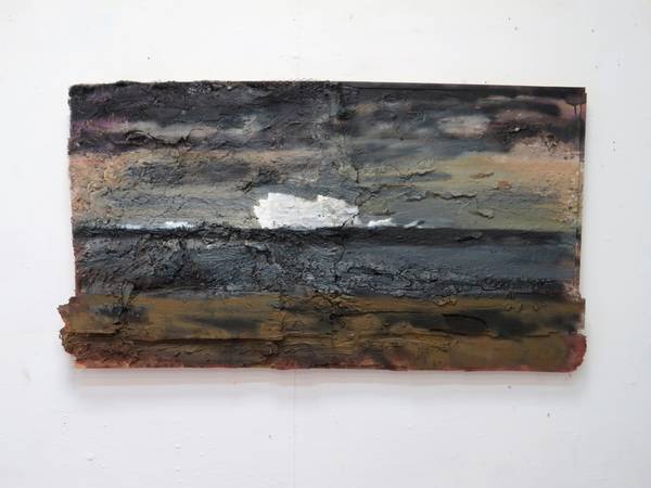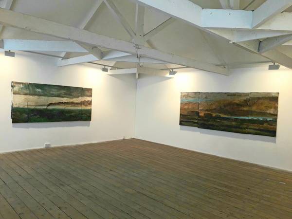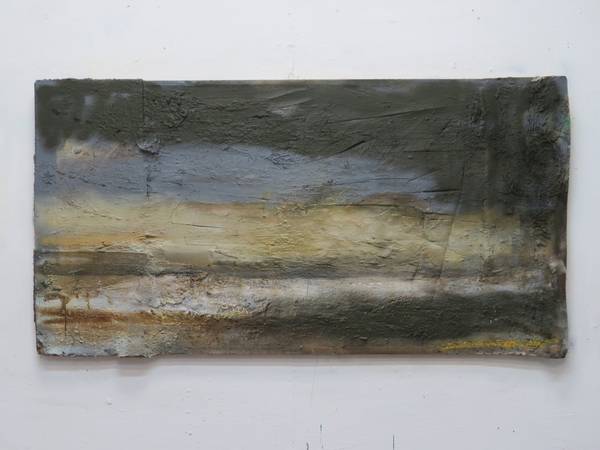 Layered landscapes are also a theme in Hardwick’s work. In terms of texture the paintings are heavily layered with different types of paint, plaster, plastics, soils, pigments, roofing felt, hay and other unconventional materials. To this rich surface relevant artefacts are often added, creating reminders or triggering memories intrinsic to a particular landscape.