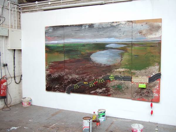 His work also looks at the more poetic wilderness zones like those of Dartmoor and Bodmin Moor. However, these are also polluted with reminders of the contemporary influence on the landscape. Roads predominate in crossing the moor, a narrow road is etched into an otherwise massive moorland triptych, likewise a real car radiator sits in the painting’s distant barrow. Toy cars, seemingly in their hundreds, form an image of a car storage compound at Royal Portbury Dock.