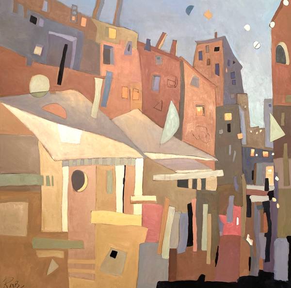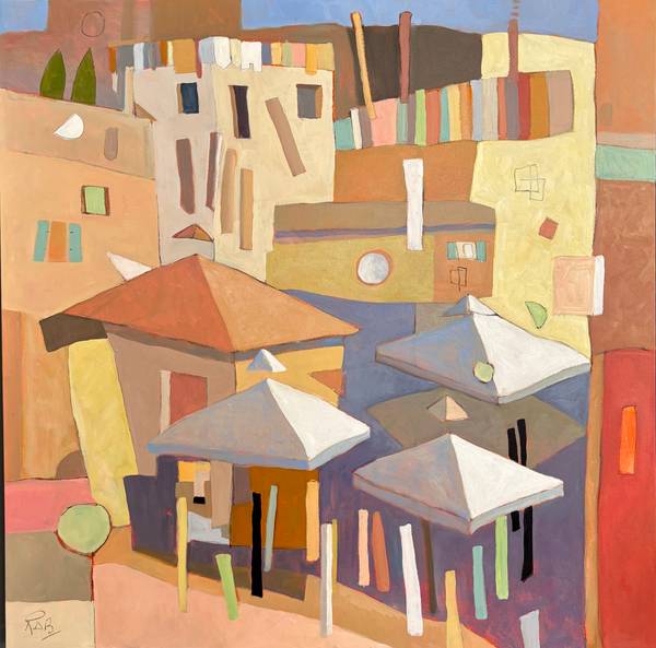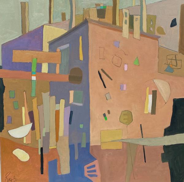 Rebecca Barnard’s painting practice is informed by a sustained engagement with architectural space, structure, and rhythm. Her work explores off-kilter cityscapes and imagined terrains, drawing on a love of Mediterranean and classical forms to examine how built environments can hold emotional and psychological charge.