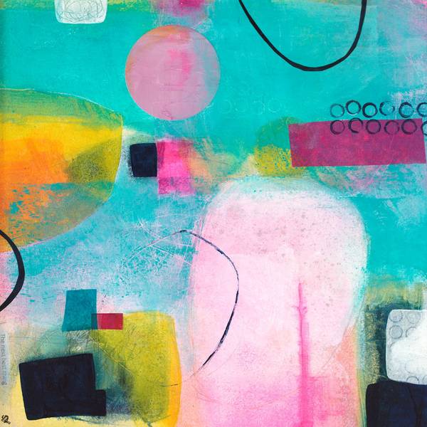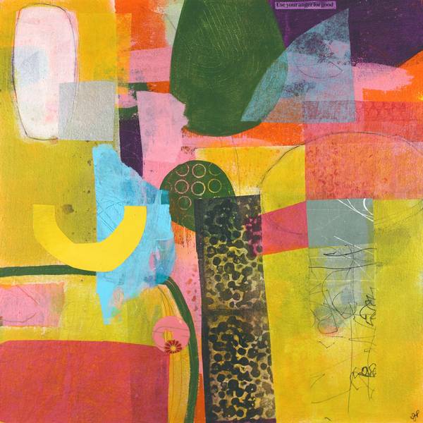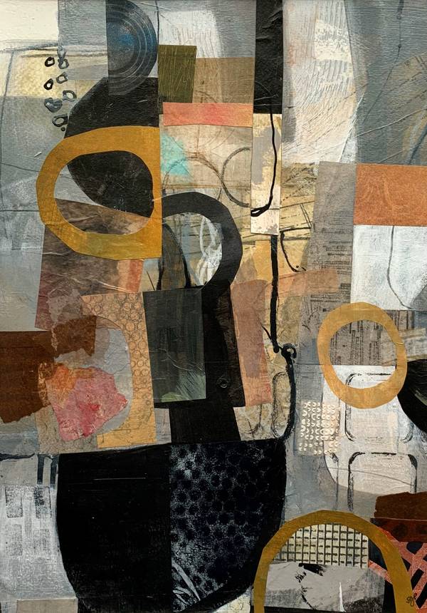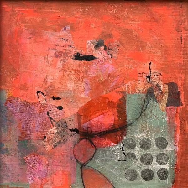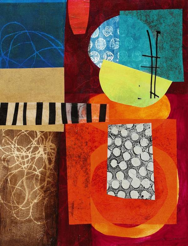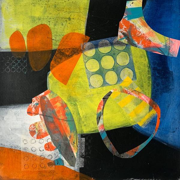 "My art practice has evolved over a number of years and currently I produce abstract pieces that combine print, paint and collage. Colour, shape and texture all play a big part in my compositions. My work draws on my background as a psychologist and my interest in communication. I often include text cut from books or magazines, although this text may be obscured by layers of paint and collage. My aim is to create pieces that speak to the viewer on multiple levels; each work is designed to be an attractive abstract visual composition with a more thoughtful message embedded within.