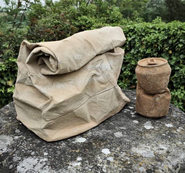 I make sculptures from stone and marble that depict discarded, mass-produced objects. Using the processes and techniques of classical marble carving, and paying close attention to form and surface detail, I achieve a high level of realism in my work. Plastic bags, cardboard boxes, and tin cans are squashed, crushed, and wrinkled, documenting the casual imprints of human use. Some of the sculptures are life-size, others are larger than life, and some appear, like fossils, emerging from the pristine rock. Materials are carefully chosen to achieve realism: white marble takes on the appearance of plastic or polystyrene, ironstone becomes rusty metal and Portland Stone is transformed into crumpled cardboard. As a sculptor, there is something extremely satisfying about transforming solid, immutable marble and limestone into the soft malleable forms of discarded objects. Despite my use of traditional materials and techniques, there are tensions and contradictions in my work: between classical and contemporary art; between temporality and permanence; and between humour and serious environmental and social issues. These contradictions can present a cognitive dissonance, challenging ideas of material value, and prompting a second look at the things we take for granted. Running through my work is a desire to express mankind’s paradoxical relationship with the natural world. We are both destructive and dependent on nature, being at its mercy at the same time as seeking to control and manipulate it. My work is infused with the uncertainty and irony of humanity’s pursuit of progress, in the end, what is the purpose of this progress? Why are we doing this?